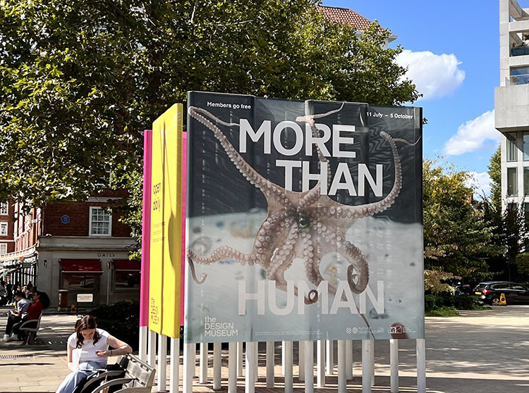 WDC以外にはthe DESIGN MUSEUMで開催中の「MORE THAN HUMAN」展を鑑賞し,以前から注目しているロンドン大学ゴールドスミス校のForensic Architectureの新プロジェクトを見る機会に恵まれました(写真:中央)。またRCAについてはバターシーキャンパスのDyson Buildingを訪問し,旧知のリサーチャーと合流し情報交換を行いました(写真:右)。