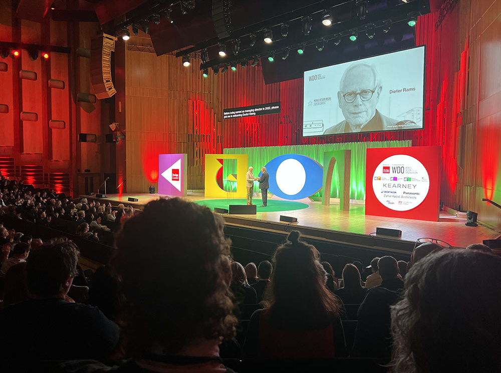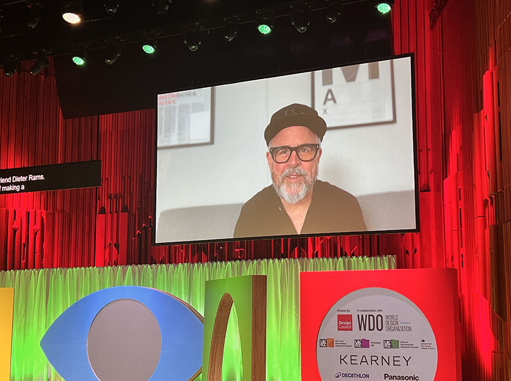 今回の調査出張のメインはWDCです。「Design For Planet」というタイトルから分かるとおり,今年はサスティナビリティとデザインの関係を地球規模で考えるというテーマ設定です。WDCのオープニングを飾ったのは霊長類学者として著名なジェーン・グドール博士のビデオメッセージでした(写真:左)。自然と人間の共生を示唆する素晴らしいメッセージに続き,今回のWDCで功労賞を受賞したデザイン界の巨匠ディーター・ラムス氏のミニドキュメンタリー上映がありました(写真:中央)。作品を手掛けたのは『Helvetica』や『ENO』等の作品で知られるゲイリー・ハストウィット監督です(写真:右)。以前から注目している「デザインが分かる映画監督」の登場であったのでとても興味深かったです。